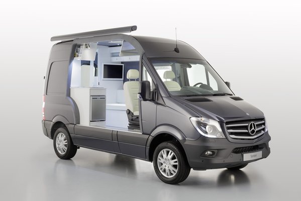 A tanulmány külsőre hétköznapi Sprinter furgonnak nézne ki, így aztán a kiállításon is simán elmenne mellette a tömeg – ezért szépen felnyitották az oldalát, hogy látni lehessen a tágas lakórészt a konyha-szekcióval, a falra akasztott monitorral, a zuhanyzó- és mellékhelyiséggel, a ruhásszekrénnyel és az ággyá alakítható kanapéval. Minden van itt, ami egy szokványos lakóautóban, legfeljebb az alapterület kisebb egy kicsivel, viszont kívülről ebből nem sok látszik – ha az ablakokra fólia kerülne, akkor lényegében senkinek nem tűnne fel a dolog. A tanulmány egyébként a Sprinter egyik legerősebb változatára épül: 3 literes V6-os dízelmotorja 190 lóerős, azaz a gyors helyváltoztatásnak sincs akadálya.