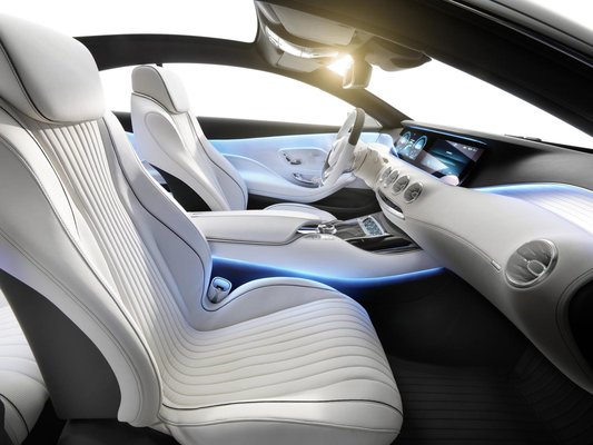 Amellett, hogy jól néz ki, az S kupé hatalmas is: 5,05 méter hosszú, 1,985 méter széles és 1,409 méter magas, azaz nem áll messze az alapjául szolgáló négyajtós S osztálytól. Így négyen is kényelmesen elférnek benne – legfeljebb a lendületes vonalú tető okozhat gondot a hátsó utasoknak, hisz ilyen kialakítás mellett aligha lesz tágas a fejtér – ami a legtöbb mai kupéra nem igazán jellemző. A belső kialakításban már visszaköszönnek az S osztály megoldásai: a műszereket helyettesítő képernyők, de az műszerfal formája és az ajtókárpitok kialakítása is szoros rokonságról árulkodik. A tanulmány persze még rátesz egy lapáttal a helyenként kékkel megvilágított hófehér kárpitozással, de valószínűleg gyártásba már kevésbé kényes színekben kerül majd a típus.