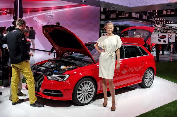 Pár lépéssel odébb egy piros Audi A3 e-Tron (konnektoros hibrid, 50 km-t tud elektromosan, ráadásul 130-cal is lehet vele úgy, csak 1570 kiló, 222-t megy, 7,6 alatt van százon, a hivatalos fogyasztása 1,5 l/100 km, az emissziója 35 g/km, az összteljesítménye 204 ló) piroslik, körülötte műfű, mellette jó csaj, nahát, 2014-ben már árusítani is fogják.