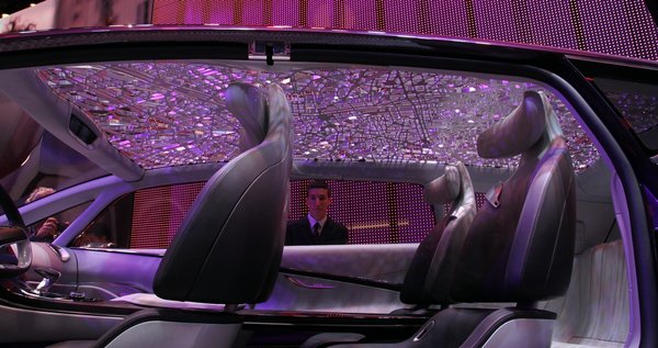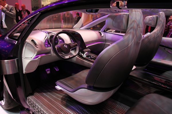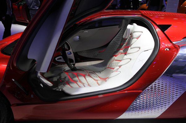 Az egyterű leghátsó (harmadik) üléssora nem is sor, hanem szorosan egymáshoz illeszkedő bőrkárpit-csíkok, melyek mozgathatóak, így olyan formát tudnak felvenni, amilyet csak akarunk. A két első üléssor ülései a levegőben állnak, ugyanis a középkonzolban futó sínhez kapcsolódnak oldalról. Az alumínium-plexi szerkezetű tetőből kimarták Párizs térképét és felülről lefelé vetítve megadja a beltér egész textúráját. Az első napon még az Eiffel-torony helyén is állt egy kis makett, pontosan ott, ahol a valóságban.