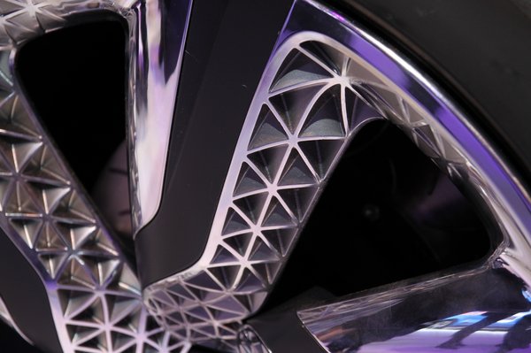 Például a felnik. Ezek mart-gravírozott és nagyon bonyolult mintájúak. Ez a fura háromszög-piramis-ötszög minta aztán folytatódik az autón végig: a küszöbökön, a lökhárító-betéteken és a karosszéria egyes elemein.