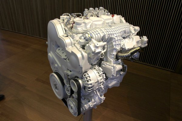 Fehérre festették a kiállított motorokat a frankfurti Volvo-standon, ami nagyon menő. Többféle szimbolikát lehet belelátni, az üres, fehér papírlaptól kezdve a hibrid Volvókig, amelyek mindig fehérben parádéznak, de nem is ez a lényeg. Hanem az, hogy ez a négyhengeres lesz a következő évtized összes Volvójában, vagyis muszáj jónak lennie.