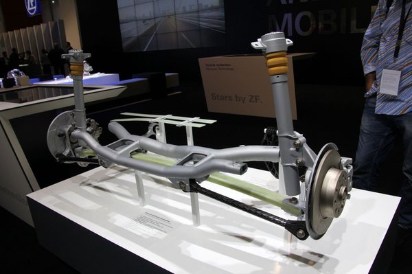 A Zahnradfabrik Friedrichshafen, ma már csak ZF, hasonló demonstrációval fogadott, mint a Bosch. Egy szellemautóval mutatták be, mi minden származhat ma már tőlük egy tetszőleges márkájú autóban, és ez elég sok. A Magyarországon is komoly gyártókapacitással rendelkező cégcsoport leginkább automata váltóiról híres, most éppen egy keresztmotoros autókhoz szánt kilencsebességeset hordoznak körbe, de van itt aktív motortartó bak, villanyszervó, és még mi nem.