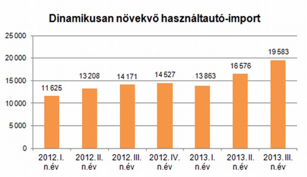 A belföldi használtautó-piac növekedésénél sokkal gyorsabb ütemű azonban a behozatal fellendülése. A vizsgált időszakban közel húszezer külföldről behozott autót helyeztek forgalomba Magyarországon, ez pedig 38 százalékkal több, mint 2012 azonos időszakában. Az import mintegy hatvan százalékát hat márka teszi ki, a legnépszerűbbek a Volkswagen, a BMW, az Opel, a Ford, az Audi és a Mercedes különböző modelljei voltak.