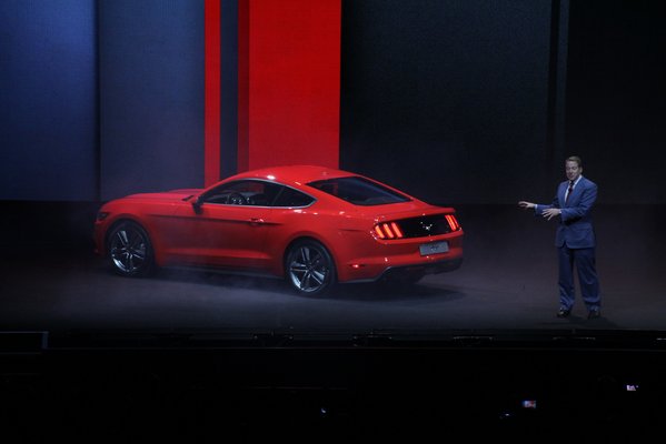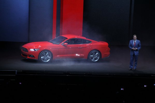 Ha már a végén kezdtem, teljesen ki is fordítom a kabátot: kezdjük a legérdekesebbel, a Ford Mustang legfrissebb generációjával, amelyet maga Bill Ford elnök röfögtetett be a színpadra sok-sok szárazjég-füst és koncertbe illő fénytechnika közepette. Az új modellt globális sportkocsinak szánják, azaz a világon mindenütt, így Európában is kapható lesz. Ennek érdekében kiciánozták belőle az olyan nevetségesen archaikus megoldásokat, mint a hátsó merev tengely, és a V8-as és V6-os motorok mellé kapott egy négyhengerest is. Ez sem rossz – a 2,3 literes Ecoboost blokkból 309 lóerőt hoztak ki – de még mindig az 5 literes V8-as tűnik igazán jó választásnak. Ez a korszerű, négy vezérműtengelyes, változó szelepvezérlésű, sportos szívómotor 426 lóerős, de ami ennél még lényegesebb, hátborzongatóan jó a hangja.