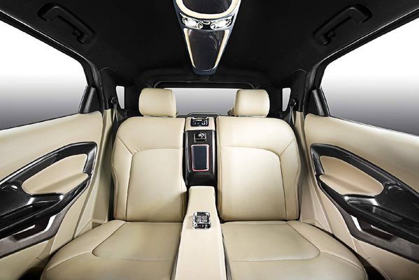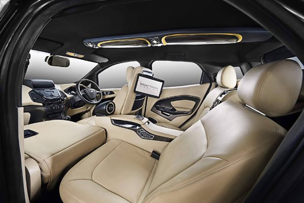 Igazán komolyan mégis az utastérnek estek neki az indiaiak. A hátsó ülést kettévágták, hogy közé toljanak egy komplett pultot, a vezetőülés háttámlájára pedig a legnagyobb képernyőt szerelték, ami csak elfért. Az első utasülés lehajtható, lábtámaszként használható, így az olcsó kis Fordban a tuningmesterek szándéka szerint hasonló kényelemben lehet majd utazni, mint egy S Merciben. A középkonzol apró kijelzőjét is gigantikus monitorra cserélték, és a fotók alapján tényleg olyan szintre hozták a spórolós Ecosport belterét, amilyet általában csak felső kategóriás limuzinokban láthatunk.