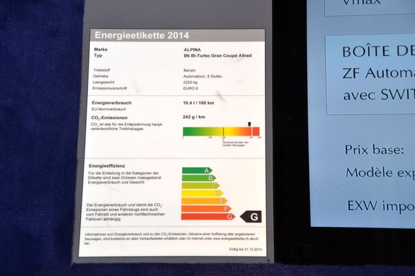 A B6-ból zárt és nyitott (Convertible) kivitel is lesz, utóbbi kicsit lassabb, csak 310 kilométerig gyorsítható, de a képen látható verzió szerencsére megfutja a 320-at is és egyiknek sem kell négy és fél másodperc százig. Ezek után nem értem, mit keresett a puha szőnyegen egy enerigahatékonysági táblázat. Azon nagyon rosszul szerepel a legerősebb Alpina.