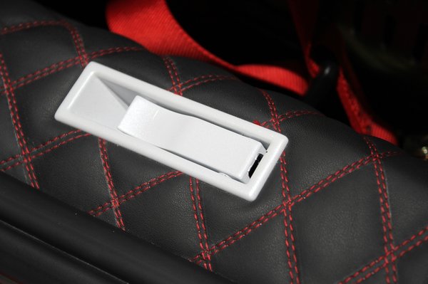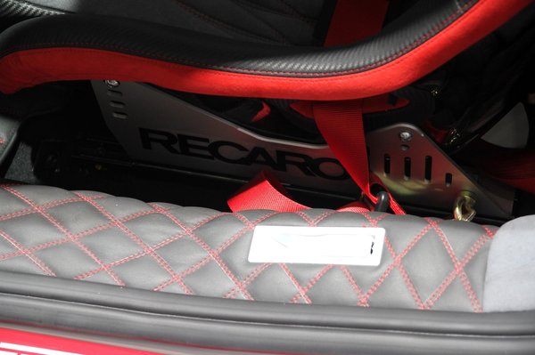 Odabent folytatódik az ámokfutás. A kormány közepéből minket figyel a harcikutya (itten kemény világ van, ágaskodó lóval sokra nem mén), oldalunkba belemar a méretre szabott Ferrari-ülés helyett filléres konzolra kendácsolt műanyag kagylóülés és körbevesz minket a piros-fehér bőrkárpit, melynek sivárságát csak itt-ott töri meg egy-egy festékszóróval pirosra vagy fehérre festett műanyag burkolat- vagy takaróelem.