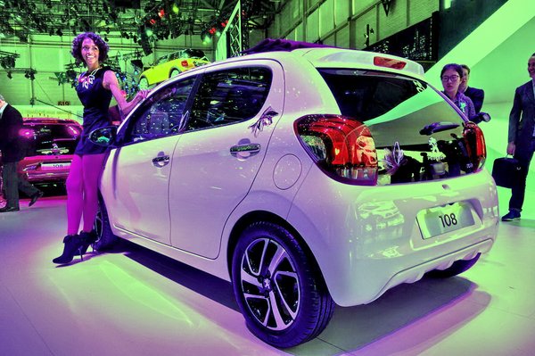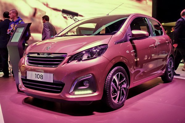 A hall másik oldalán Peugeot-ék szokásos, felfoghatatlanul rossz világítású standján, szűken egymás mellé passzírozva álltak a 108-asok. Itt már nagy volt a zsibongás, alig volt pillanat, amikor le lehetett kattintani az autót, és amikor mégis, épp olyan lila fényben derengett, hogy szinte értékelhetetlen lett a fotó. Mindegy, azért remélem, látszik.