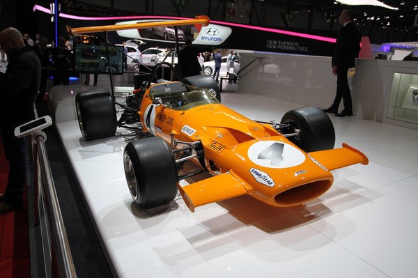 Nézzünk valami szebbet. Itt van például kezdetnek Bruce McLaren versenyautója, amit számomra teljesen érthetetlen módon alig fotóztak. Bezzeg a pódiumon forgó P1 és 650S szinte lemattult a vakufényben. Érthetetlen. De önök nézzék csak meg. egy darabka Forma-1 történelem minden idők legsikeresebb F1-es motorjával, a csodás Cosworth DFV-vel.