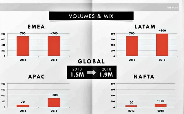 Érdekes, hogy a Fiat márkától Európában csak az eladások fenntartását várják: a tervekben a tavalyi 700 ezer autós szint szerepel 2018-ra is. Ugyanakkor Ázsiában – elsősorban Kínában – 70 ezerről 300 ezerre, Észak-Amerikában 50 ezerről 100 ezerre, Latin-Amerikában 700-ról 800 ezerre szeretnék növelni az eladásokat a következő négy évben. Ezzel összességében 1,5 millió helyett 1,9 millióra növekedne a Fiat márkájú személyautók eladása világszerte, amivel a tervezett forgalomnak mintegy a harmadát tenné ki a márka. Ez nem tűnik valami ambiciózus tervnek, de a vállalatcsoport nem is a Fiat márkára koncentrál, helyette az Alfa Romeo, a Jeep és a Chrysler márkákkal szeretnének csodát művelni.