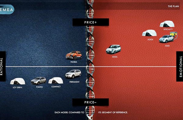A Fiat márka Európában nincs igazán jó bőrben, de úgy néz ki, új modellekkel megpróbálják visszaszerezni elveszett piaci helyzetüket. Ennek érdekében kétfelé választják a kínálatot: az 500-as és változatai maradnak afféle félprémium modellek, viszonylag magas árakkal, és ennek köszönhetően jó haszonkulccsal. Ezen felül várható egy rétegmodell is – a találgatások szerint ez a Barchetta roadster utódja lesz, a Mazda MX-5 műszaki alapjain. Ugyanakkor kialakítanak egy olcsóbb Fiat személyautó-sorozatot is, ide tartozik majd a Punto, a Fiat Qubo utódja, a Panda, illetve többféle kompakt modell, amelyek árban állítólag felvehetik majd a versenyt a Dacia típusokkal. Érdekes módon egyelőre marad a kínálatban a Freemont, a Dodge Journey szabadidő-autó Európában kínált változata. Úgy tűnik, ez a modell megtalálta a maga közönségét kedvező ár-érték arányának köszönhetően.