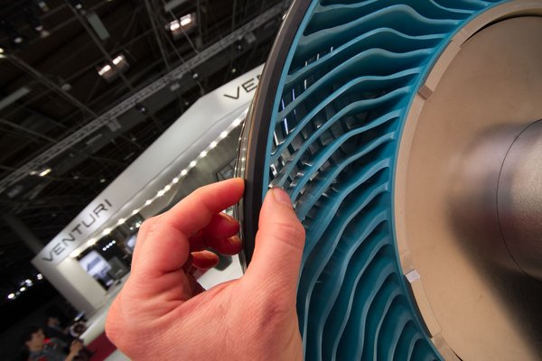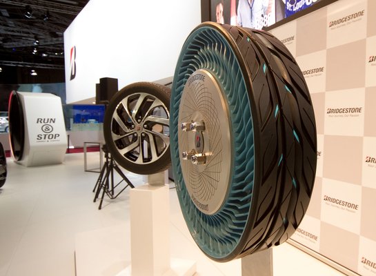 A standon kiállított kerék már a második prototípus, amit a Bridgestone elkészített, és a gyakorlati próbákat is megkezdték vele. Igaz, egyelőre nem normál személyautón, hanem a Toyota által Tokióban üzemeltetett kísérleti villanyautón tesztelik, városi forgalomban.
