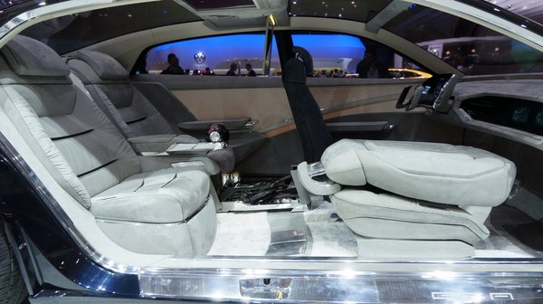 A látvány és a rejtett high-tech alap: az ajtók bőrkárpitját hátulról LED-panelek világítják meg, a műszerfal és az utas előtti tér pedig holografikusan vetített, adott szögből teljesen 3D-élményt ad. Az egész műszerfal (ha lehet annak nevezni) mindössze hat gombot tartalmaz, nem többet.