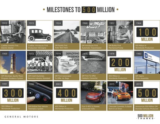 Az 500 millió legyártott autó kapcsán a GM-nél igyekeztek érdekes történeteket előásni a céggel és márkáival kapcsolatban. Például találtak egy nyuigdíjast Minnesotában, aki a mai napig egy 1957-es Chevrolet pick-uppal jár, amelyet 38 éve vásárolt 75 dollárért. Vagy ott van annak az Opel tulajdonosnak a története, aki a világ számos pontjára eljutott az autójával – többek közt Hawaiira is autóval jutott el.
