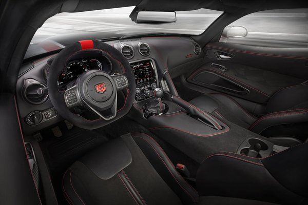 Mivel utcán is használható az autó, így a belső tér sem olyan puritán, mint egy célszerszámnak mondható versenygépnél. A kárpitozásban, az üléseken és a kormányon is a bőr-Alcantara kombináció az uralkodó. Emellett persze a vásárlóknak személyre is szabják a Viper ACR-t, ha elég mélyen zsebbe tudnak nyúlni.