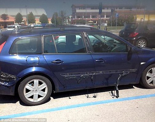 Meglepő képeket rögzített a brit turista: a Renault Mégane kombi egyes műanyag alkatrészei egyszerűen elolvadtak, és lefolytak az úttestre az észak-olasz hőségben.