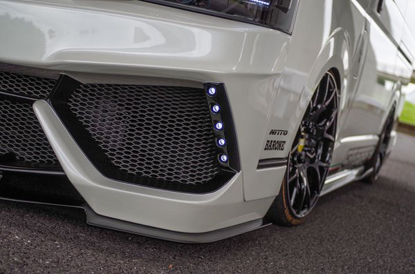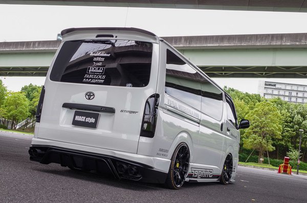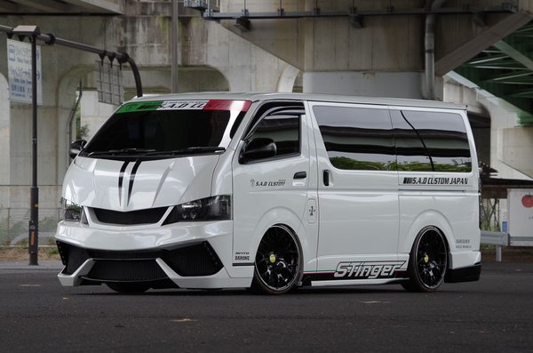 A tuner a S.A.D. Custom, egy Japánon kívül teljesen ismeretlen csapat. Honlapjukon alig van infó, az is japánul, annyit azonban megtudni a Facebookjukról, hogy ezzel a Stingernek keresztelt dizájn-kisbusszal bekerültek a Hiace Style magazin(!) friss számába. A japán tunerkultúra őrületes termékei közt elveszik a Stinger, olyannyira, hogy még a címlapra sem volt elég. Talán túl európai a stílusirány, merthogy a minta egy Lamborghini, az orr részleteit nézve bárki megmondhatja.