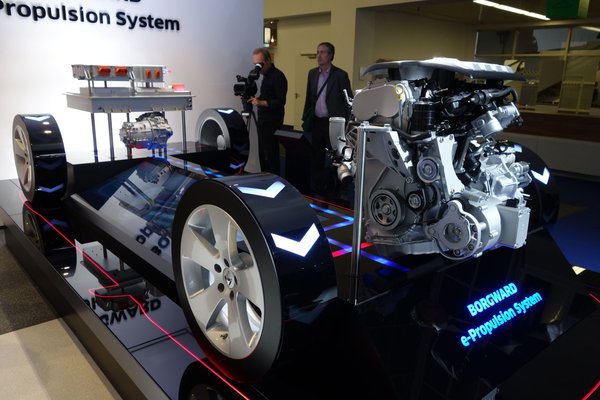 Van nagy monitor középen, mindenféle csatlakoztathatóság, a kocsi alatt pedig állítólag egy 225 lóerős, kétliteres, benzines turbómotorból, duplakuplungos váltóból és összkerekes gépészetből álló hajtáslánc van, amelyet később a Siemensszel közösen fejlesztett, az összteljesítményt 400 lóerőre felnyomó hibrid rendszer is kiegészít majd. Külön a hibridet láttam kibontva a kiállított autók mellett, csak azt nem érzem, hova tömik majd be azt a sok elektronikát és gépelemet.