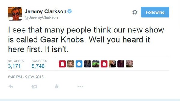 Jeremy Clarkson azonban most saját Twitter-oldalán cáfolta ezeket az értesüléseket. Nemes egyszerűséggel annyit tett közzé a közösségi portálon: „Úgy látom, sokan már tudni vélik, az új műsorunk címe Gear Knobs lesz. Nos, itt első kézből megtudhatjátok: nem.” Persze ebből a rövid cáfolatból semmi egyéb nem derül ki, Clarkson semmiféle utalást nem tett arra, hogy akkor mégis mi lesz a tényleges cím.