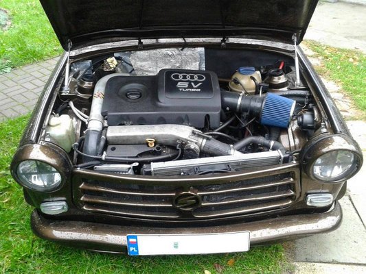Az autó 1.1-es Trabantként kezdte a pályafutását, és jelenlegi gazdája 14 éve vásárolta. Az hamar eldőlt, hogy az ősi Polo motor negyven lóereje nem lesz elég, de a késői Trabik egyik előnyös tulajdonsága, hogy viszonylag egyszerűen beleépíthetők az eredetinél nagyobb Volkswagen motorok. Így hamar 1,3, 1,8, majd 2 literes négyhengeres került az ezeregyszázas helyére. Ám Arek, a lengyel megszállott még ennél is többet szeretett volna. 2013-ban jött szembe a nagy lehetőség egy törött, de műszakilag nagyrészt épen maradt Audi TT formájában: az 1,8 literes, 20 szelepes turbómotor kiváló tuningolhatóságáról ismert, az összkerék-hajtás miatt pedig a teljesítmény átvitele sem okozhatott többet gondot.