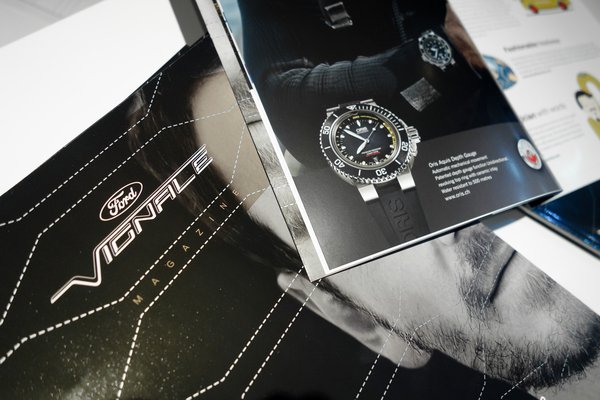 Már távozóban voltunk a szalonról, s Gajdán Miki Év Autója-zsűritag kollégámmal épp azon elmélkedtünk, hogy mechanikus karóra-vonalon hová lehetne tenni a Vignale Mondeót a skálán egy Audihoz képest. Én a Sector-Breitling hasonlatot kezdtem épp erőltetni (technikás, látványos cuccok), amikor egy paksaméta Vignale-magazint pillantottam meg a Ford-pulton. Ebben biztosan megtalálom, mert ide biztosan az az óragyártó teszi a pénzét, amelyik érzi a célcsoportot! - csillant fel a szemem, és nézzék csak, milyen hirdetést találtam a drága hátsó borítón...