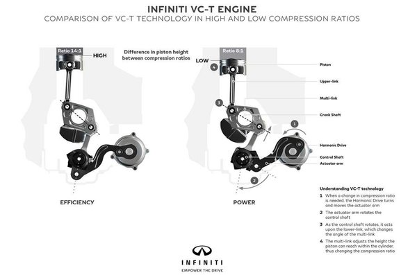 Az eddig közzétett ábra szerint a Nissan VC-T-nek nevezett megoldásában egy csuklós mechanizmust iktatnak a főtengely és a hajtókar közé. Ennek alsó bekötési pontját elmozdítva válik lehetségessé a sűrítési viszony változtatása 8:1 és 14:1 között úgy, hogy közben a főtengely és a motorblokk távolságát nem kell megváltoztatni. Magas sűrítéssel használva a kétliteres, turbós négyhengeres hatásfoka jelentősen javítható, míg indításnál, illetve nagy teljesítményigény esetén kisebb sűrítést alkalmaznak. A VC-T motor fogyasztása állítólag megközelíti egy azonos méretű dízelmotorét – a Nissannál 27% fogyasztáscsökkenésről beszélnek – a teljesítménye viszont 270 lóerő. A tervek szerint ezzel váltják majd le a 3,5 literes V6-os motort az Infiniti összes modelljében.