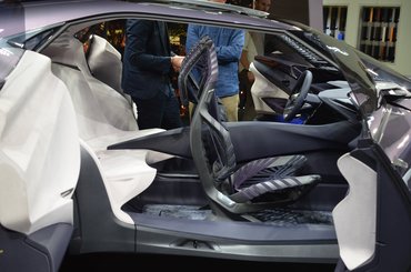 Persze megvannak az ilyenkor szokásos túlkapások. A duzzadt kerékjárati ívek és a visszapillantó tükrök helyére szerelt kamerák még jelzik, hogy várni kell, mire ebből autó lesz. És ez semmi, ahogy egy korai tanulmánynál lenni szokott, odabent szabadult el igazán a fantázia. Azok az előre került fura hálós ülések önálló tanulmányok, ki is állítottak belőlük egyet Kinetic Seat Concept néven. Beleülni nem engedtek, de azt mondják rá, ezzel a rugalmas, egymásba font hálóval nemhogy pihentető, de egyenesen egy jóféle tornázás a vezetés.