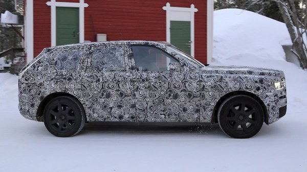 Még az erősen álcázott prototípuson is jól látható a márkára jellemző szögletes orr – a légellenállás bizonyos ár felett már nem érdekes kérdés, akinek gond a fogyasztás, az úgysem vesz ekkora luxusautót. Hogy az első tetőoszlop mögött milyen az autó, arról már nehezebb világos képet alkotni, bár nem valószínű, hogy a hosszú hátsó túlnyúlást csak az álcázás kedvéért alakították volna ki. Azt már korábban elárulták, hogy a Cullinan is egymással szemben nyíló ajtókat kap, akár korábban a Phantom, és meg is figyelhetők a középen összenövesztett kilincsek.