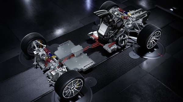 A képen megfigyelhető az apró, 1,6 literes V6-os a nagyméretű, karbonszálas légszívó idom alján – ez alatt lakik a hosszú tengelyű, elektromos turbófeltöltő, a motor egyik különleges megoldása, amelyhez hasonlót utcai autóban eddig még nem alkalmaztak. Látható az akkumulátor-csomag elhelyezése is, ez az első kerekek mögött helyezkedik el, a padlóba integrálva, és az is kiderül a képről, hogy a kettős keresztlengőkaros futóművek versenyautó-mintára nyomórudas rugózást kapnak, ám a lengőkarok fémből készülnek, és nem szálerősítésű műanyagból, mint a versenygépeken.
