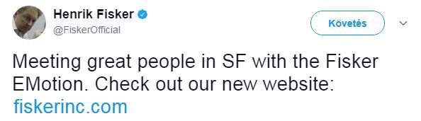 A most megjelent fotót Henrik Fisker töltötte fel Twitter oldalára, ahol ő szerepel az Emotionnel, és ezt írta a kép alá: „Nagyszerű emberekkel találkozunk San Franciscoban, a Fisker Emotionnel”. A dán származású formatervezőnek nem ez az első szokatlan reklámfogása.
