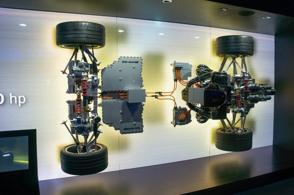 Az 1,6-os turbómotor az elektromos turbóval és a váltóra szerelt elektromos rásegítéssel 670 lóerőt ad le (ehhez még jönnek az első kerekeket hajtó motorok - a szerk.), a teljesítmény korlátozása pedig a legnagyobb fordulatszám korlátozásával érhető el. A mérnökök algoritmusokkal dolgoznak, ami alapján meghatározható, hogy meddig kell lemenni, hogy utcán is használhassuk, 11 ezres fordulaton szabályoz le.