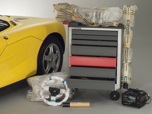 A kérdéses autóban összesen 239 km van, ami annyit jelent, hogy az 1997-es sportkocsival csak a gyári tesztpályán tettek meg akkora távolságot, amekkorát a finomhangolási és minőségellenőrzési eljárás megkívánt a típus gyártása idején. Az autó ráadásul egy rakás érdekes kiegészítővel érkezik: megvan hozzá az aranyozott titán szerszámkészlet, amelyet a típushoz kínáltak, a konkrét példány alvázszámát viselő TAG Heuer óra, a gyári bőröndkészlet, egy Facom szerszámtartó kocsi, egy F1 LM stílusú kipufogórendszer és egy F1 GTR-hez gyártott tartalék kormánykerék.