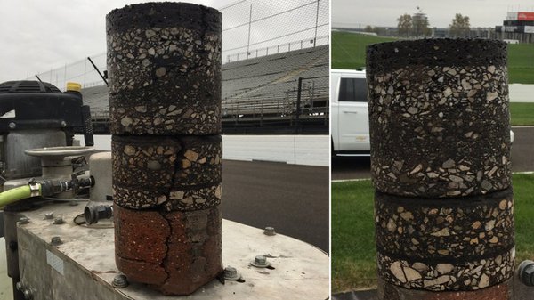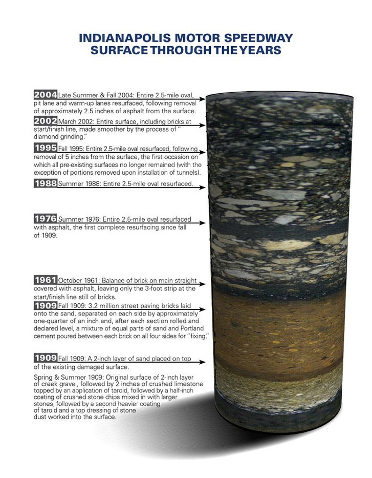 A fúrásmintát a következő felújítás előtt vették és gyakorlatilag ott van rajta az amerikai autósport legnevesebb versenypályájának teljes történelme. Az a vörös sáv az alján például még a pálya építésének idején került a helyére, 1909-ben és nem más, mint tégla, ami részben egészen az ötvenes évek végéig volt a pálya borítása – rajta zajlottak a hőskor Indy 500-asai és még sok más verseny. A hatvanas években jött a teljes aszfaltozás, amit aztán többször megismételtek. Egészen a felső negyedéig korhű a minta, utána bekavar a képbe, hogy nem minden felújításnál hagyták meg a régi borítást, volt, hogy visszamarták a korábbiakat.