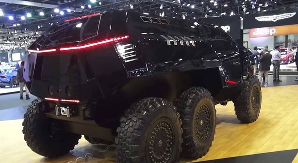 A jármű külsőre érdekes keverék: nehéz eldönteni, hogy a legújabb sci-fi mozi kellékének készült-e, vagy katonai terepjárónak. Mindenesetre hatalmas, ballonos terepgumik kerültek az űrkomp-fazonú karosszéria alá. A műszaki tartalomról egyelőre keveset tudunk, csak annyi biztos, hogy egy 6,7 literes V8-as turbódízel motor mozgatja a járművet, amely 720 lóerős, a csúcsnyomatéka pedig 1000 Nm. Legalábbis ezt ígérik, bár egyelőre arra sincs semmi bizonyíték, hogy a Dubajban kiállított autó egyáltalán mozgásképes.