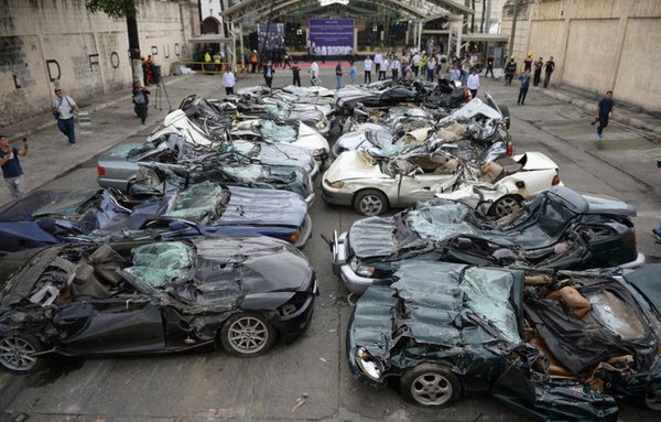 A vámhivatalok által lefoglalt autók bezúzása amúgy nem példátlan gyakorlat. Nem mindenhol lánctalpassal csinálják; van, ahol az úthengert veszik elő, van, ahol a markolót.
