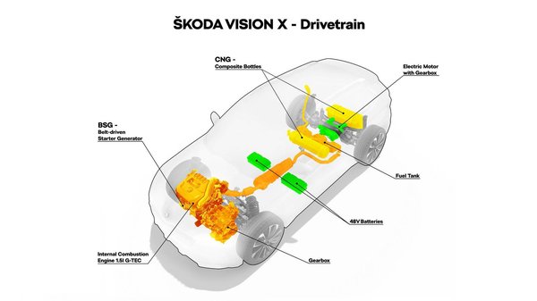 A Vision X-hez meglehetősen szokatlan hajtásrendszert álmodtak meg. Az autó orrában ott lesz a Volkswagen csoport viszonylag új, 1,5 literes TSI turbómotorja, pontosabban annak CNG-s üzemre is képes, G-Tec változata. Ebben a formában 130 lóerőt tud, csúcsnyomatéka 250 newtonméter. Két villanymotorja közül az egyik kombinált önindító-generátorként működik, valamint az első kerekek hajtásába is besegít, a másik pedig hátul hajt.