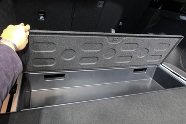 Például motoros a csomagtérajtaja, tehát mostantól elmaradhat a kézpiszkolás. A hátsó üléssorának támlája 40:20:40 arányban, három részben dönthető. Sín van a csomagtartó padlójában, amelybe Audi-stílusú csomagtérrendező korlátrendszert lehet tenni. Abban a padlóban pedig még van két további rekesz is (ezek térfogatát nyilván beleszámolták a 600 literbe, mert akkora csodák azért nincsenek), egyik csak ilyen ezmegaz-tároló, az van beljebb, a másik viszont arra való, hogy a csomagtérrolót teljesen el tudjuk tenni szem elől. És van kampó, tizenkét volt, lámpa, rögzítőfül is – teljes körű hát a szolgáltatás.