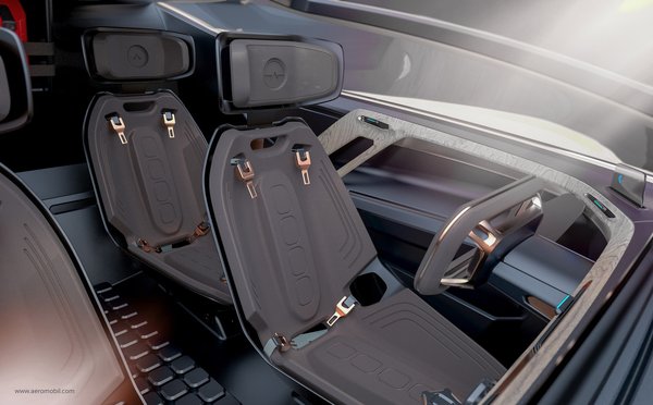 A koncepció egyébként hasonló: az 5.0-s Aeromobil is az utasfülke mögé hajtogatja be a szárnyait, a különbség csak annyi, hogy a szárnyak végén itt két propeller is található. Ezek drónként emelnék a levegőbe a járművet, amelyet itt már akkumulátorok táplálta villanymotorok mozgatnának.