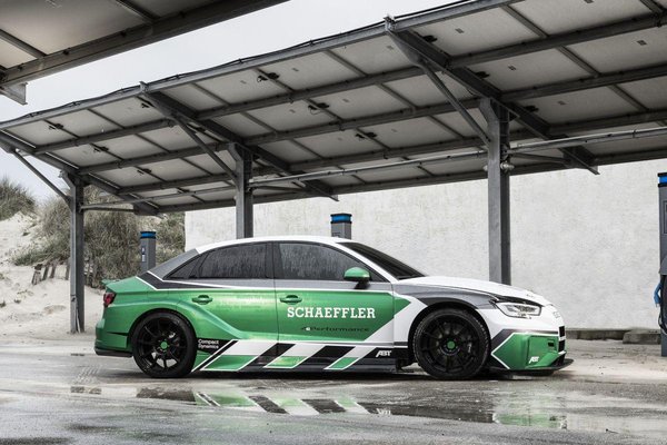 Lényegében fogtak egy széria Audi RS3-ast, kidobták belőle a hajtásláncot, és beépítettek négy olyan motort, amilyenből egy a tavalyi a ABT Formula E versenyautót hajtotta. Minden kerékre jut egy-egy motor, így összesen 1200 lóerő mozgatja a kompakt négyajtóst.