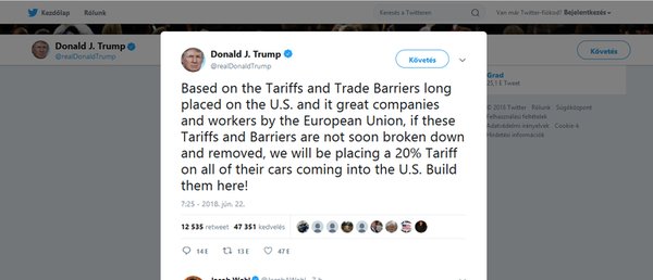 Az amerikai elnök pénteken megfenyegette Európát, hogy 20 százalékos vámot vet ki az Európai Unióból importált autókra, ha az európaiak nem bontják le gyorsan az amerikai termékeket sújtó vámokat és kereskedelmi akadályokat. Szokásához hűen megint a Twitteren fenyegetőzött Donald Trump.