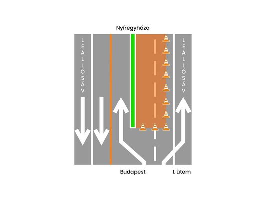 Itt kétféle útlezárási megoldást alkalmaznak majd: ahogy a képeken is látható, mindkét esetben 2x2 sávon haladhat a forgalom, az egyik esetben a Budapestre vezető oldal irányába húzzák el a sávokat, a másikban pedig a Nyíregyháza felé vezető oldal két sávja között folyik majd az építkezés. A menetidő növekedését tehát nem a sávok számának csökkenése okozza majd, hanem a 80 km/h-s sebességkorlátozás, amely a kérdéses szakaszon érvényes lesz az építkezés ideje alatt. A cég emellett azt is közölte, hogy 1,22 milliárd forintot költenek az út felújítására, költségvetési forrásból.