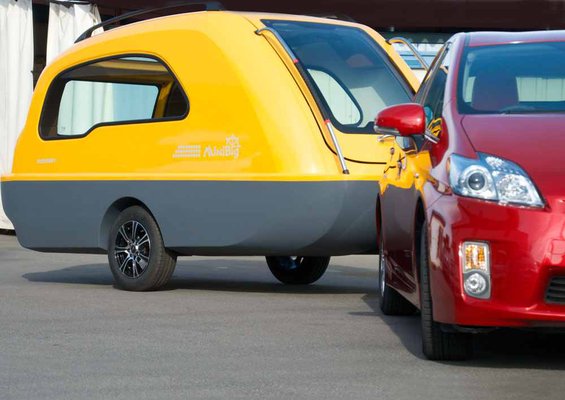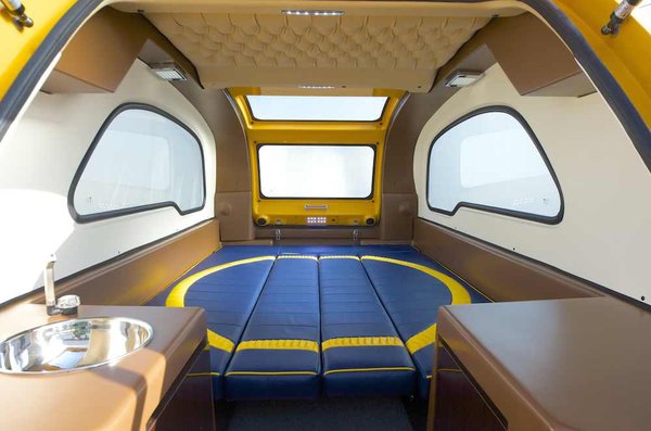 Pedig az alapötlet ugyanaz: építeni valamit, ami jól úszik, tenni alá néhány kereket, bele ágyat, mosogatót, meg ami a lakhatáshoz még kell, és kinevezni lakókocsinak. Csakhogy a japán Minibigben nyoma sincs a német megalomániának, és az ára is csak negyedannyi. A narancssárga-szürke készülék egyik legnagyobb erénye, hogy kedves jelenség: a 4,39 méter hosszú, 1,64 méter széles és 1,93 méter magas kétkerekű kerek formájából az egyszerű ladik-test sem lóg ki, ha nem lógna a hátulján a csónakmotor, nem is feltételeznénk, hogy vízen is elboldogul.