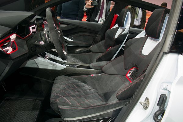 A belső tér is messze áll bármilyen aktuális Škodától, arról nem is beszélve, hogy négy egyedi sportülést pakoltak a belsejébe. A szinte mindenhol karbonnal és alcantarával borított belső térből azért azt is le lehet szűrni, hogy a belső formák újabb generációja merre indul el. Ez egy fokkal modernebb, mint a Kodiaq és a Karoq belseje: a szerelvényfal lépcsőzetes egy kicsit, a légbefúvókat meg szintén háromszögesítették. A központi kijelző egy odatűzött tablet, viszont a középső légbefúvó beépítését nem akarták összeegyeztetni vele, ez elég mélyre került. Fura, mert az új kori Škoda eddig soha nem rendelte alá a formának a funkciót, még a Felicia Fun esetében sem. Aztán persze meglátjuk, mi lesz a realitás a Rapidnál.