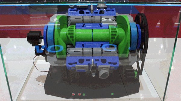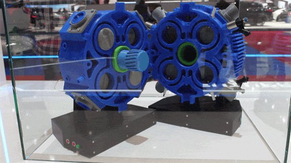 Ezek között kettő is akad, amely kifejezetten érdekes, bár nem teljesen ismeretlen axiáldugattyús motorokat ábrázol. A hordómotornak is nevezett szerkezetből egy ellendugattyús elrendezésű típust láthattunk, ahol két szemben járó dugattyú határol egy-egy égésteret, amelyek egy-egy szinusz-pályás forgórészre dolgoznak rá egy-egy csap közbeiktatásával. Ez borzasztó látványos, de egyrészt korántsem új ötlet - már az 1930-as években is készült hasonló terv - másrészt egy egész csomó, igen nehezen megoldható műszaki problémát vetne fel, ha nem csak egy mozgó makett volna, hanem egy belső égésű motorra jellemző nagyságrendű erőket kellene átvinni. Ilyesfajta fejlesztésekből több is fut a mai napig, de sokat elárul róluk, hogy eddig egyetlen változat sem került szériagyártásba.