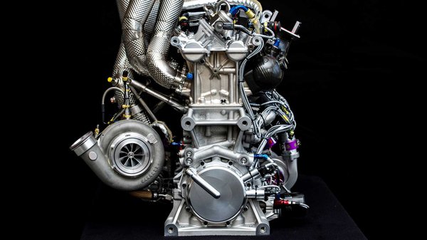 A most nyilvánosságra hozott képeken még csak a mérőpadon látható a motor, de ez is elég tanulságos. A karcsú blokk köré épített motor meglepően könnyű, mindössze 85 kilót nyom, és 9500-at forog percenként. Két literből 610 lóerőt hoztak ki, ami ugyan nem példa nélkül álló érték versenymotorok között, viszont a 95 kg/h-s fogyasztási limittel, ami csak rövid időre növelhető 100 kg/h-ra, alighanem ez is az elérhető maximum környékén van.
