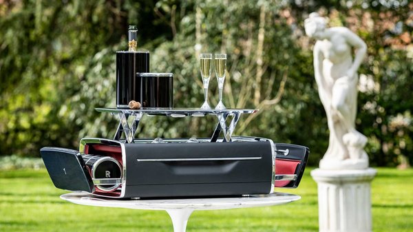 Pedig lényegét tekintve egy pezsgő és poharak szállítására kialakított bőrönd, de abból nem akármilyen. Ebből itt a kinyitás után V alakban kandikálnak ki a poharak, hogy erről is a Rolls V12-es motorja jusson a gazdája eszébe. A pohártartó rész teteje pedig krómozott, X alakú konzolokon támaszkodó fabetétes, krómkeretes asztalka, méretben épp megfelelő, hogy azon tároljuk a poharakat, ha épp nem fogyasztunk belőlük. A pezsgőt, kaviárt, szendvicskéket a hőszigetelt hordócskákban lehet tárolni, amiket a ládika oldalába süllyeszthetünk, vörös bársony fészkekbe.