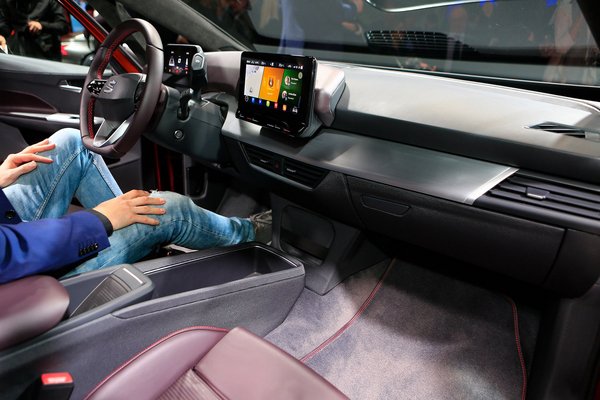 Az egész autó legkülönlegesebb része, a hűtőrács, ami nincs. Háromszögmintás, de zárt orr-részt kapott, ami a lökhárítóban és a C oszlopban visszaköszön. A felnik nagyon futurisztikusak, és mint az már sok tanulmánynál kiderült, valószínűleg sokkal szolidabb formában találkozunk majd velük a végleges modellen. Ha az autó arányait félretesszük, néhány elemében emlékeztet a Model 3-ra, ami a Tesla legújabb és legkisebb villanyautója jelenleg.