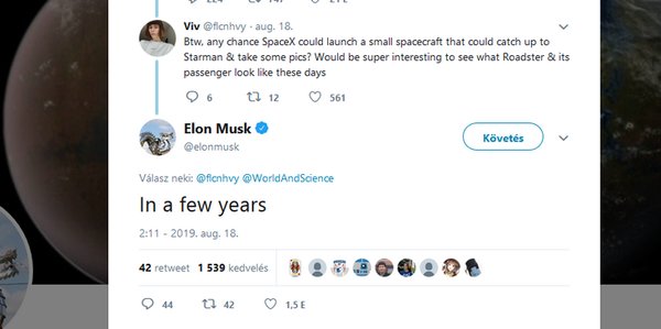 Amúgy van bármi esélye annak, hogy a SpaceX elindít egy kis űrhajót (szondát), ami utoléri Starmant és készít róla néhány képet? Nagyon érdekes lenne megnézni, hogy néz ki a Roadster és utasa manapság. Így szólt a Musknak címzett kérdés, amire annyi volt a válasz: Pár éven belül.