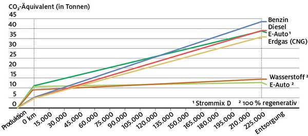 A jelenlegi németországi energiamixet (hiába terjed rohamosan a megújuló forrás, túl sok lignitet égetnek) figyelembe véve - ami az elektromos autók tényleges "üzemanyaga" - a földgázhajtású autó életciklusában kisebb környezetvédelmi lábnyommal rendelkezik, mint az elektromos. Az elektromos hajtású autó csak abban az esetben előzné meg a földgázhajtásút, ha száz százalékban megújuló forrásból generált áramot használna fel a közlekedéshez.